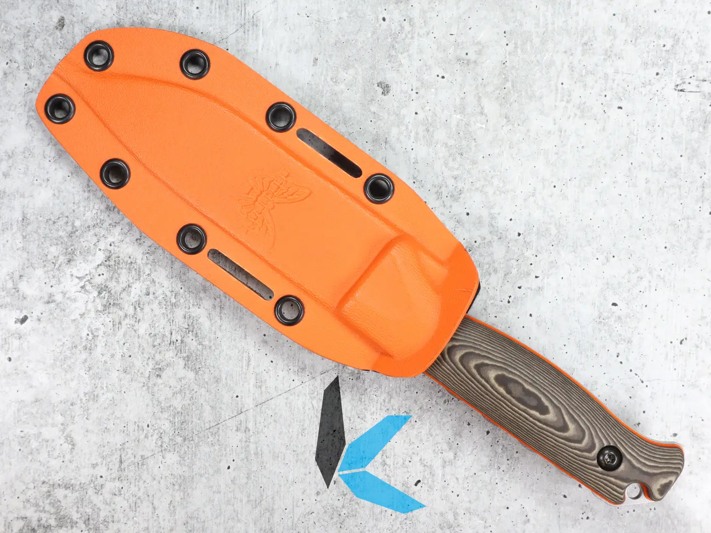 This Benchmade Saddle Mountain Skinner comes equipped with a premium CPM S90V stonewashed blade featuring the fiercely sharp SelectEdge® for ultimate precision cutting and edge retention. The handle is made of richlite with orange spacers. Includes black and orange kydex sheath.