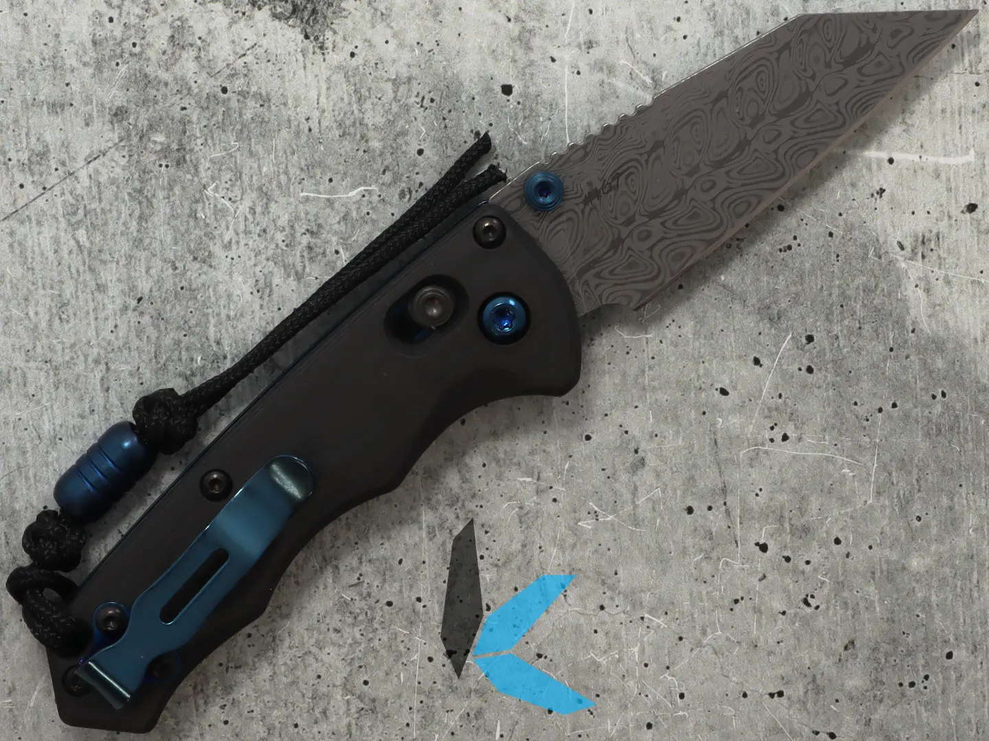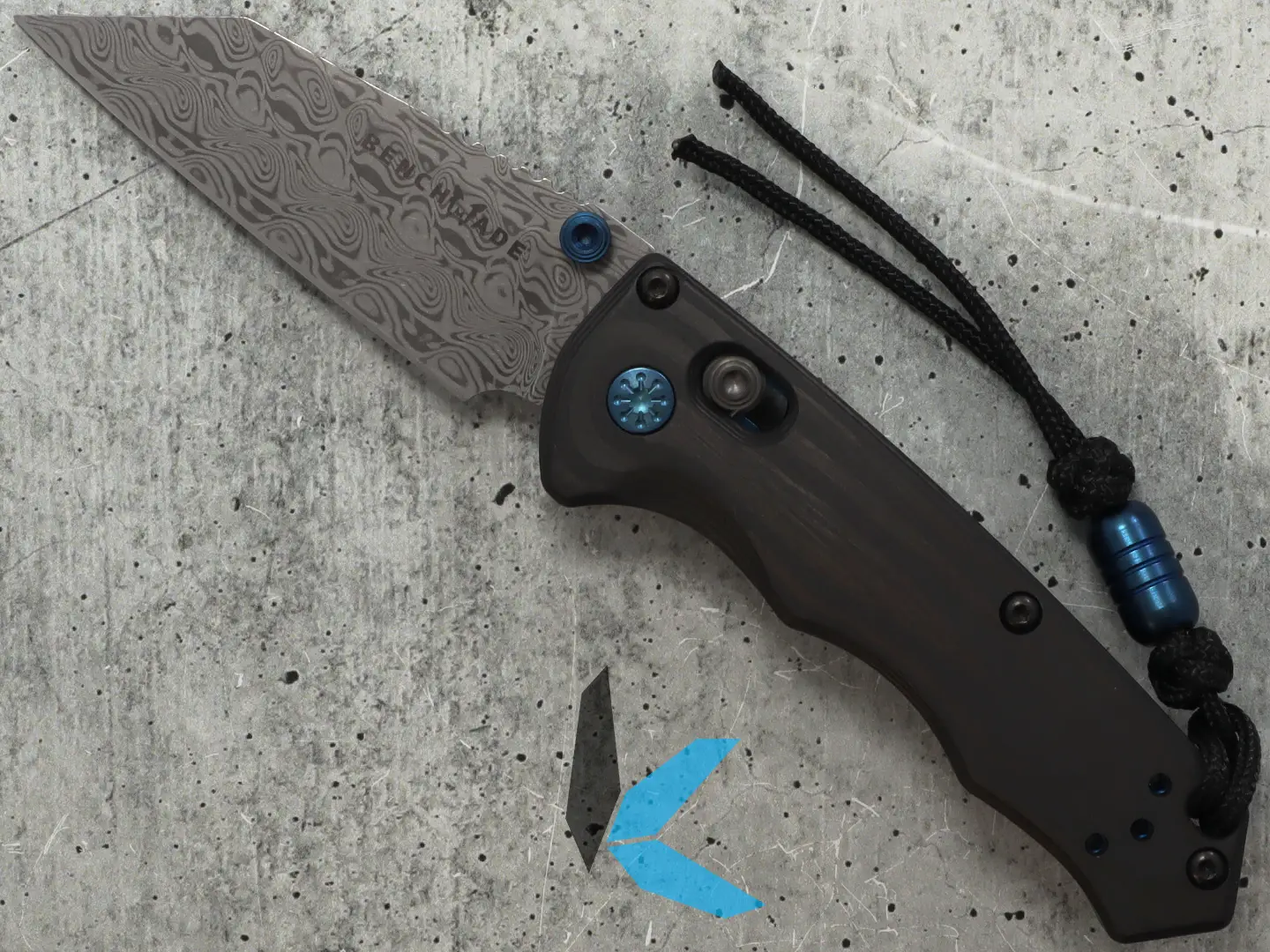 This sub-compact folder boasts unique, ultra-premium materials, including an Aegir patterned Damasteel Wharncliffe blade, unidirectional Carbon Fiber handle scales with an elegant black wood grain effect, and vibrant Sapphire Blue accents. The blue-beaded lanyard adds both style and practicality for easy retrieval.