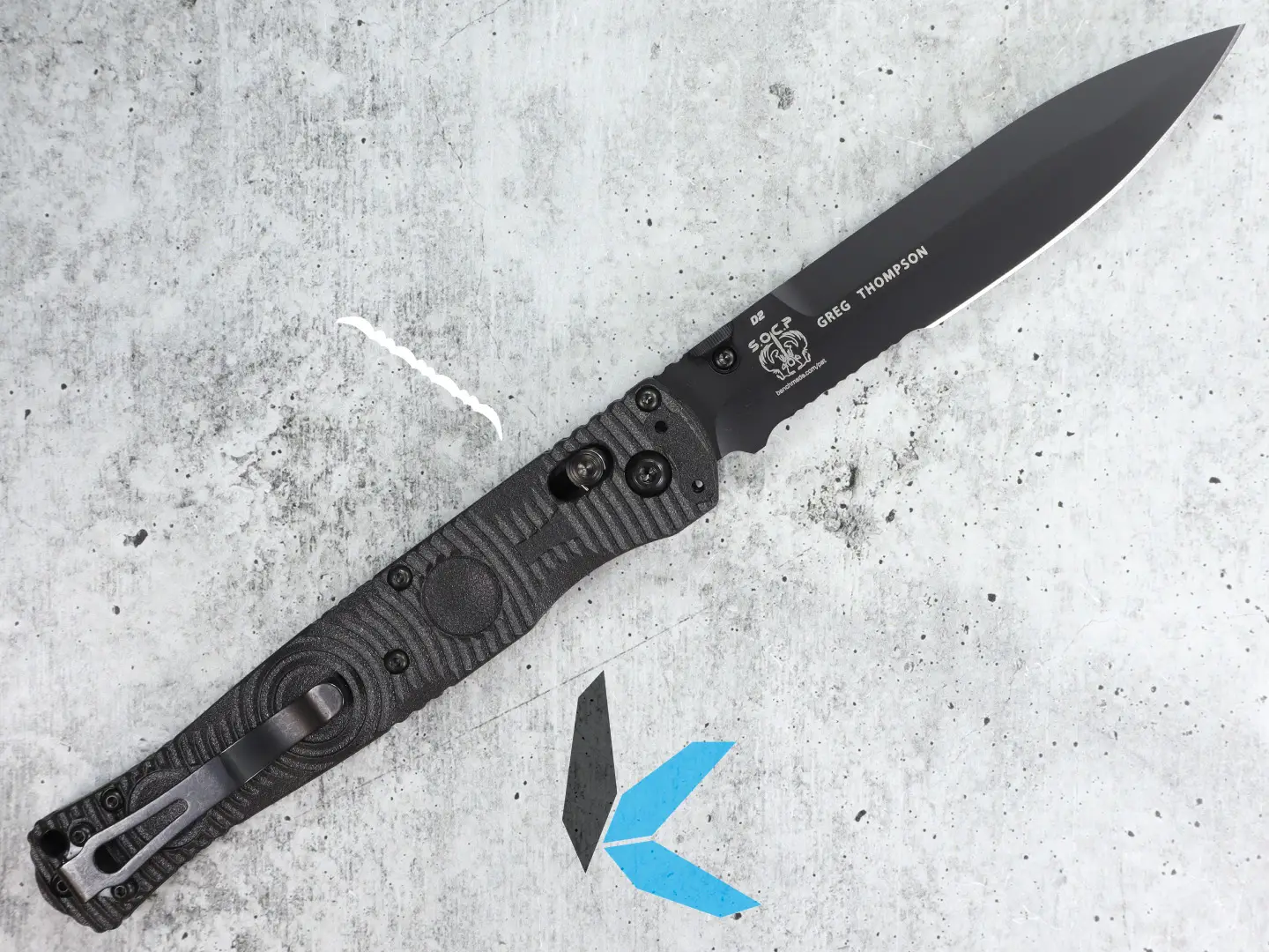 This Benchmade SOCP features a partially serrated black coated D2 blade, and a CF-Elite handle with a carbide glass breaker, AXIS lock, and fully reversible and ambidextrous carry clip.