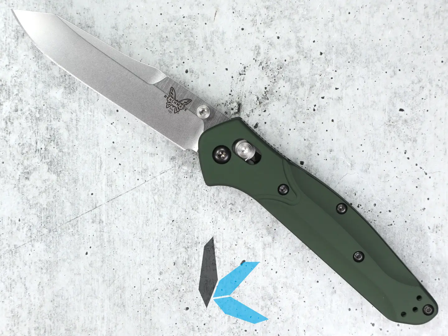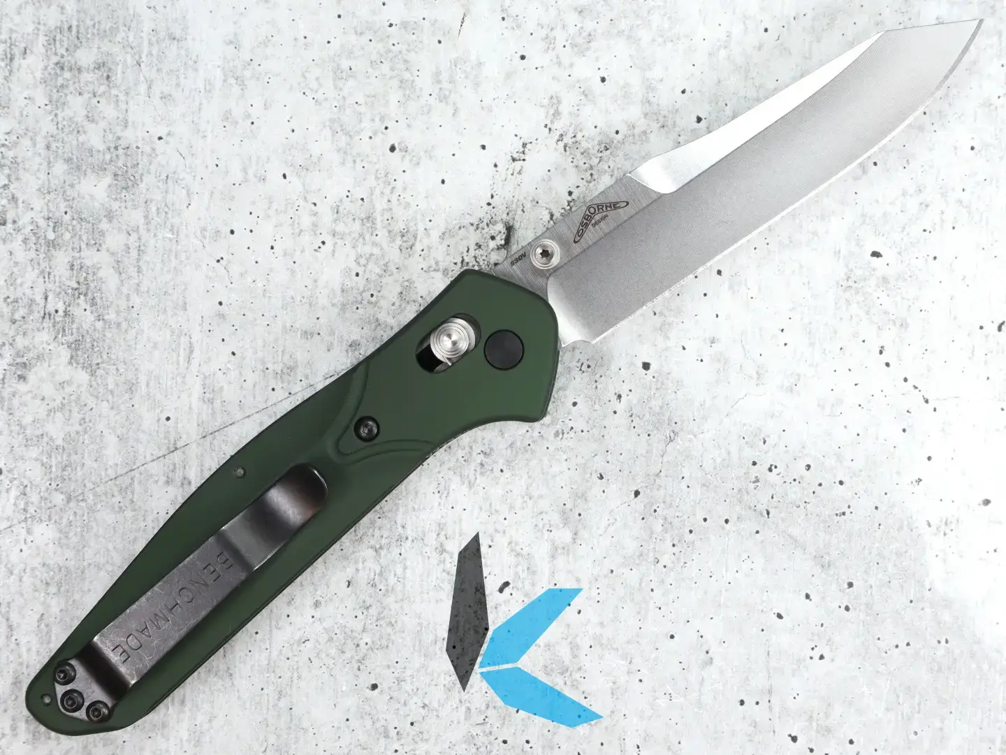 This Benchmade 940 Osborne features a CPM S30V satin reverse tanto blade, and green aluminum handles with an axis lock system.