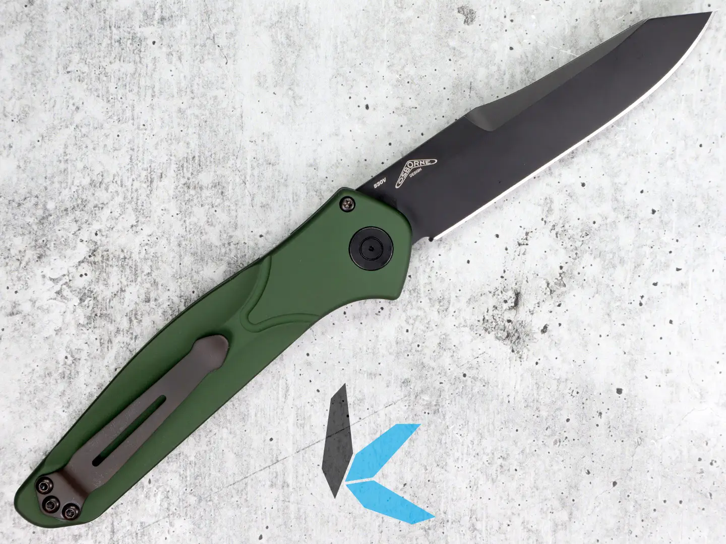 This Benchmade Osborne Auto features a DLC coated S30V blade, and green aluminum handle. The action is push button activated, and uses a plunge lock. The knife can be carried right or left-handed tip-up.