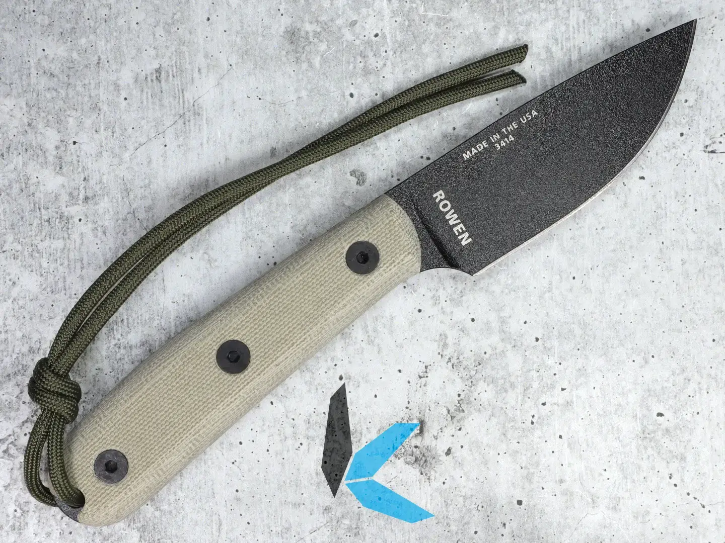 This ESEE knife features a canvas micarta handle with a paracord lanyard, and a black coated 1095 steel plain edge blade.