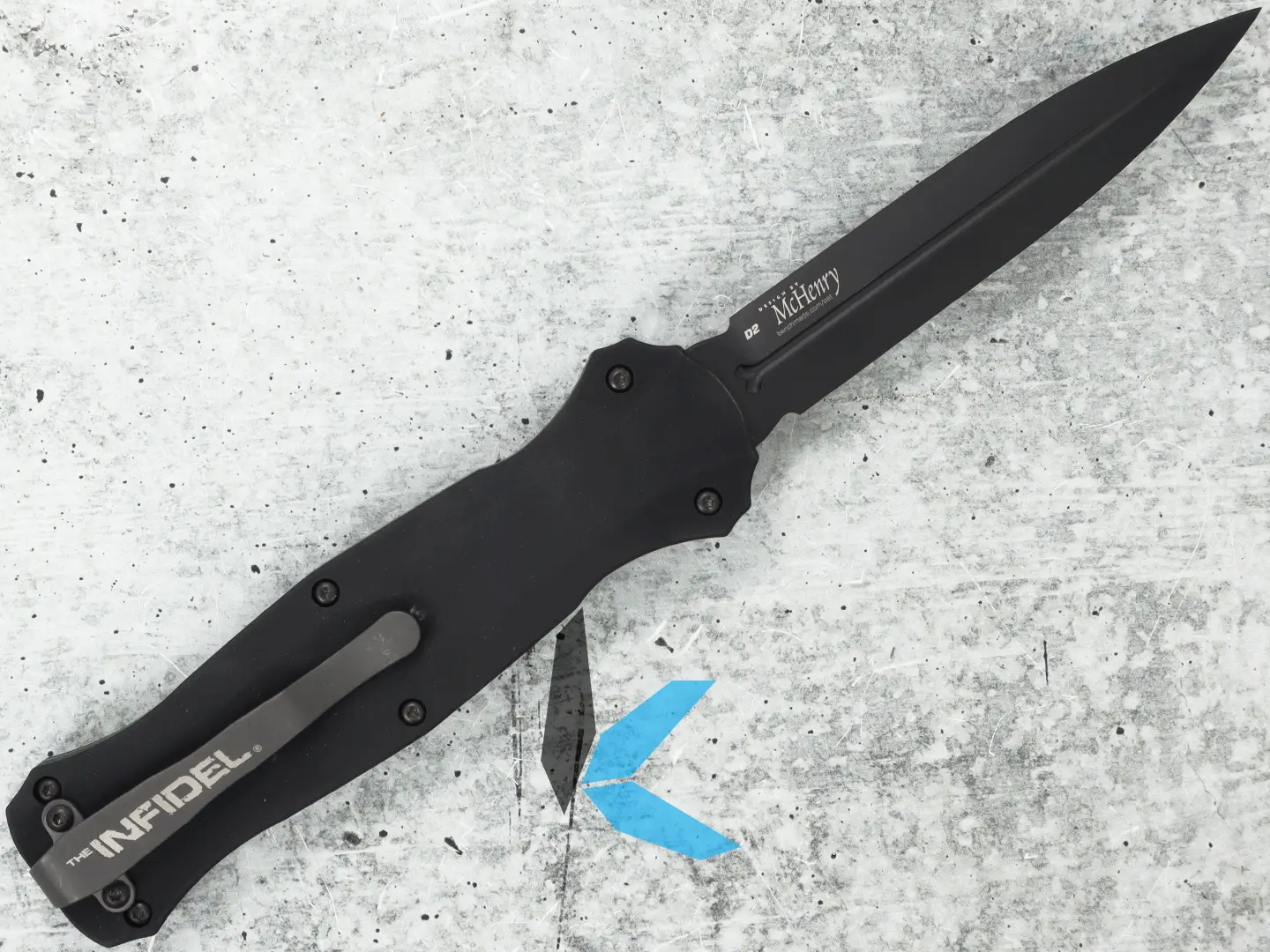 The Infidel’s patent-pending double-action mechanics ensure flawless operation over the long haul. With a simple push of the ambidextrous thumb-slide, the spear-point D2 steel blade fires with authority and locks securely into place using a unique three-point retention system. Reverse the motion, and the blade retracts with lightning speed, ready for the next task.