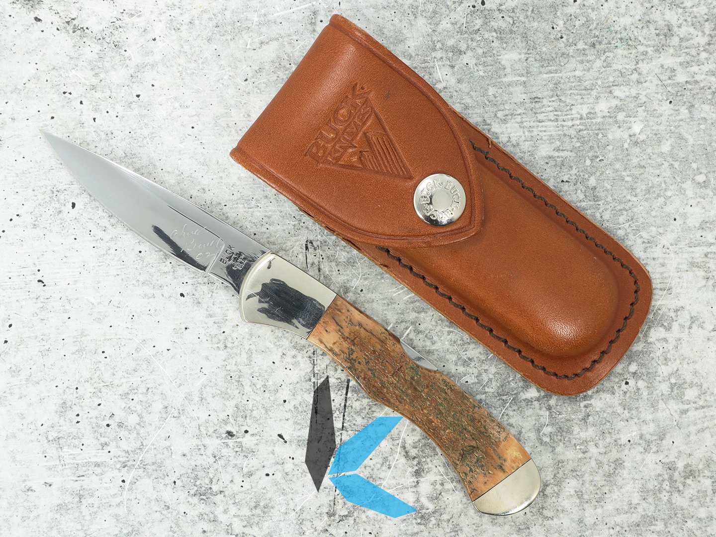 The pre-owned Buck Custom folding knife is in good condition and comes with sheath.