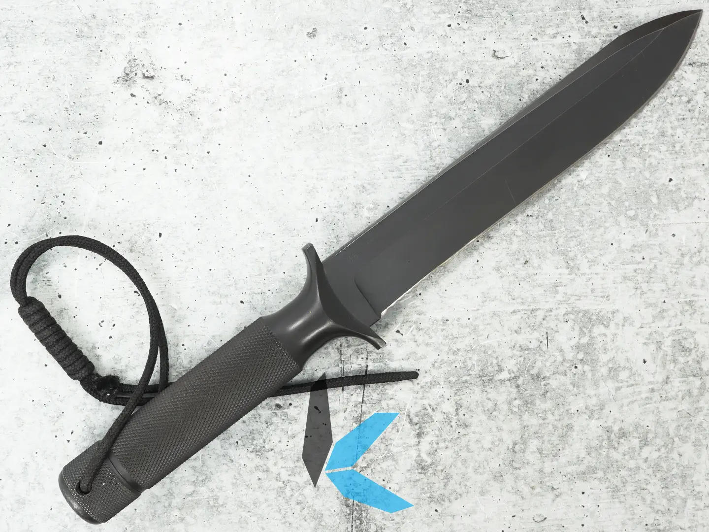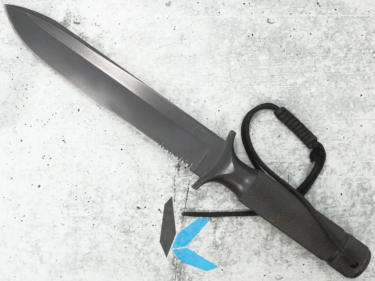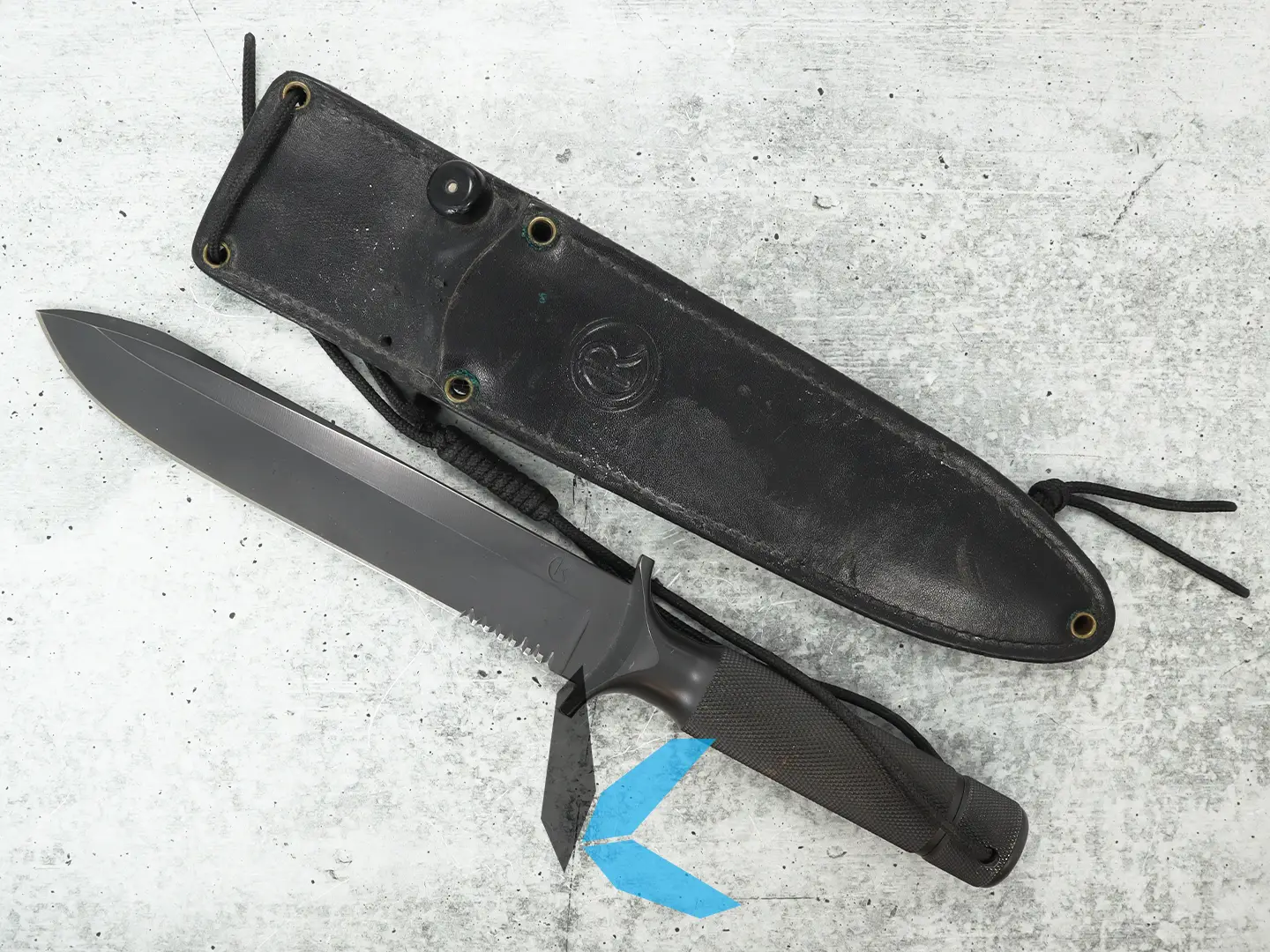 This used Project I spear point knife was designed with Sgt. Karl Lippard, USMC, to meet the demanding needs of Marines. Its 7.5″ A2 tool steel blade excels at chopping, digging, and cutting, while the wave serrations handle cord and harness with ease. The 2″ cross guard includes a night index for tactile orientation. Balanced and robust, this knife comes with a symmetrical leather sheath for left- or right-hand carry.