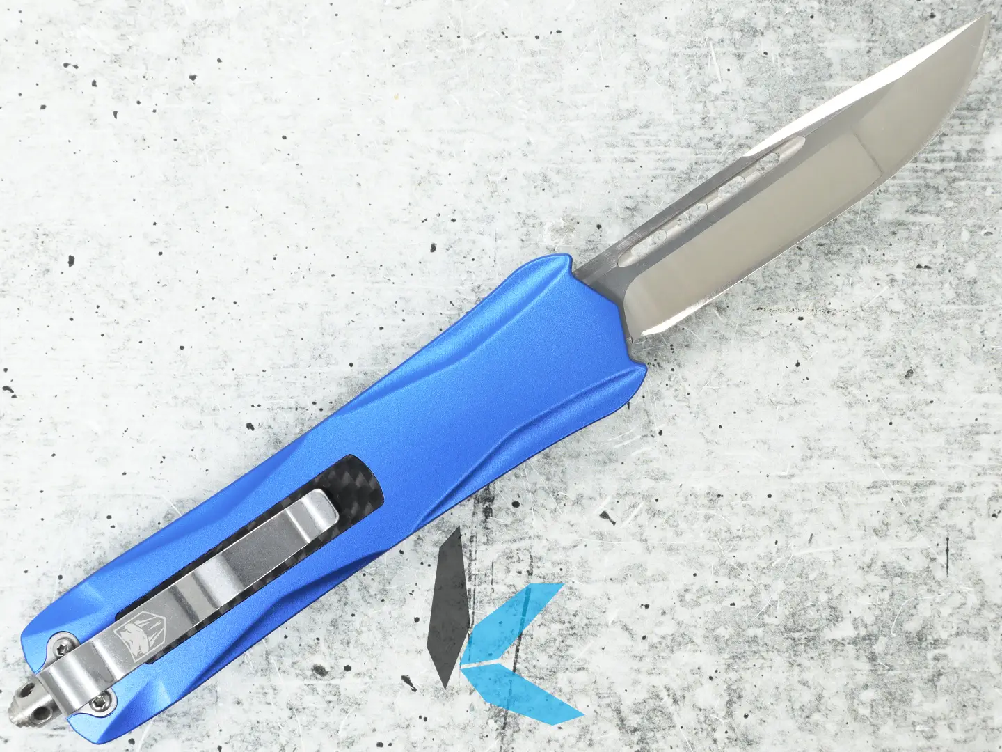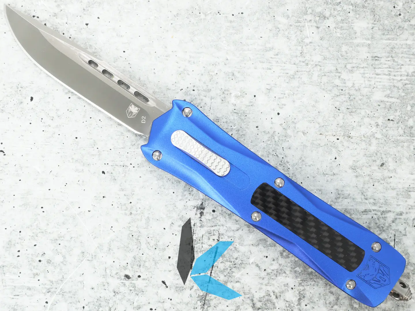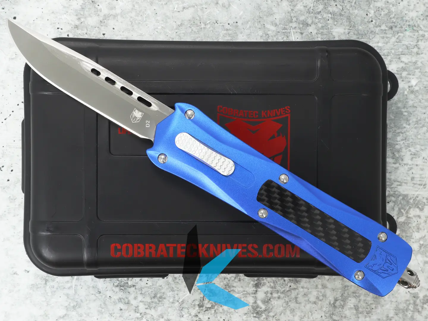 Pre-owned Queen Cobra — a fast, stylish OTF built for quick deployment and everyday reliability. It features a 3.13″ satin-finished D2 steel drop point blade housed in an anodized 6061-T6 aluminum handle with striking carbon fiber inlays. The blue finish offers a bold look, while the integrated glass breaker and pocket clip add practical functionality. Shows signs of prior use but remains fully operational and carry-ready.