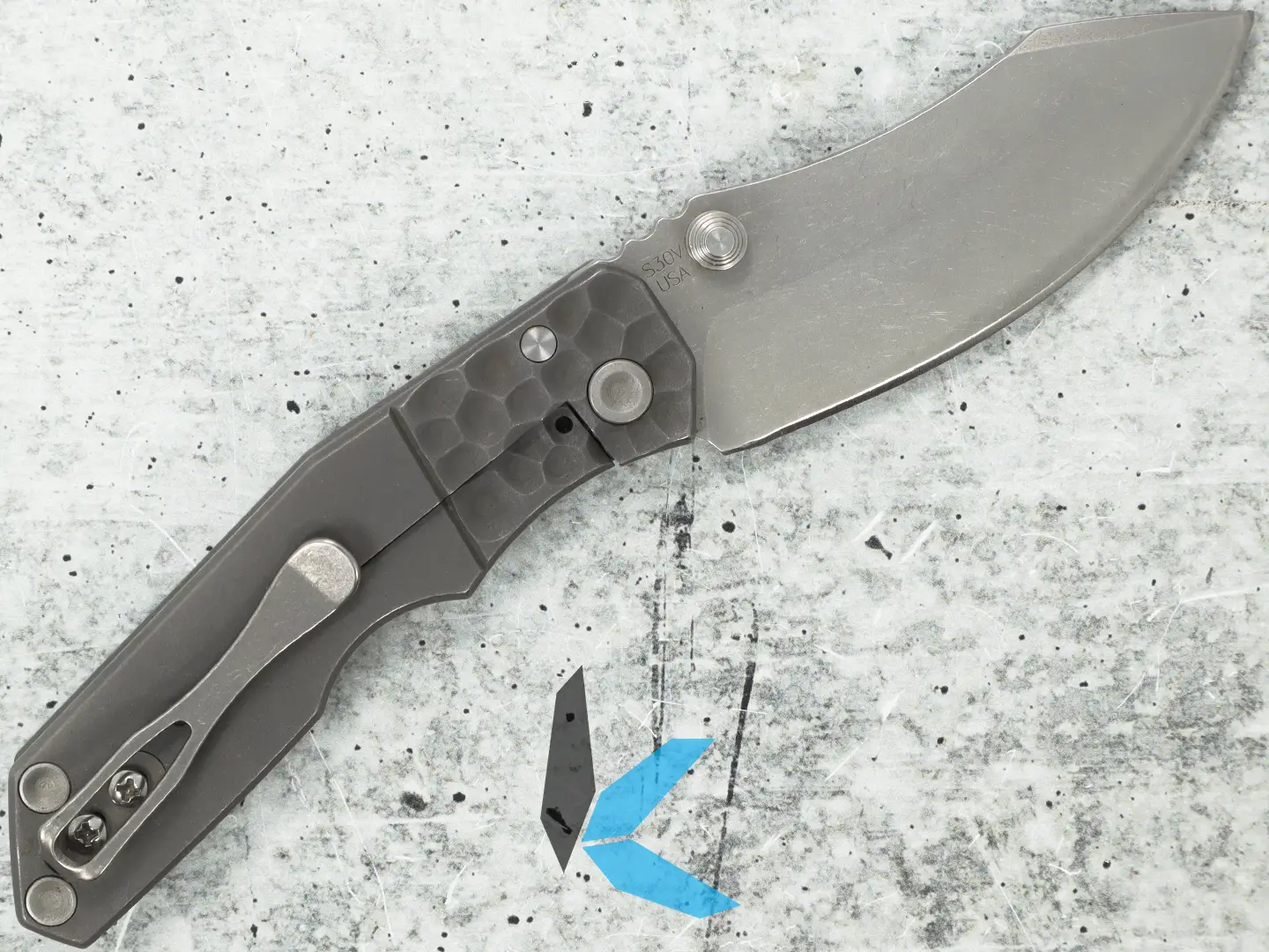 The gray titanium handle is machined with a pseudo bolster and “dragon skin” texturing that adds grip without excess flair. A carbidized lock face ensures smooth operation, while the recessed titanium pocket clip offers discreet and secure tip-up carry.