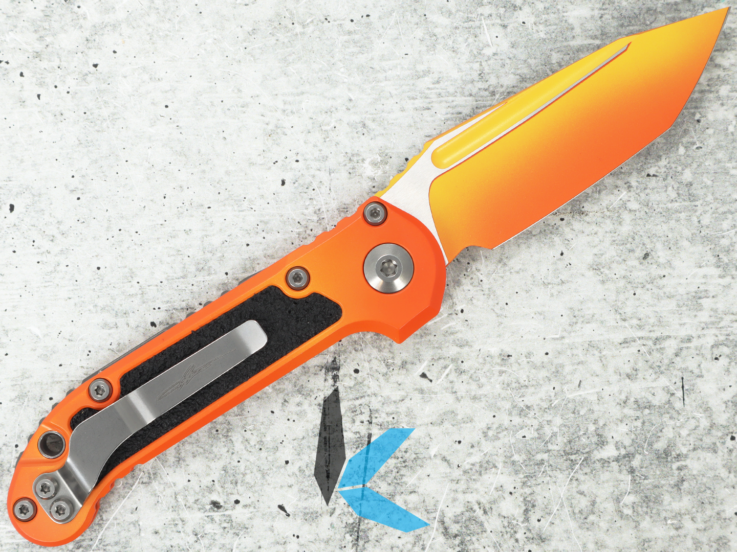 The 3.45″ tanto blade is crafted from Böhler M390MK stainless steel, offering excellent edge retention, corrosion resistance, and durability. A flat grind, reinforced tip, and integrated fuller (blood groove) provide strength and efficient cutting performance. The Sunrise Cerakote finish adds visual appeal while improving wear resistance.