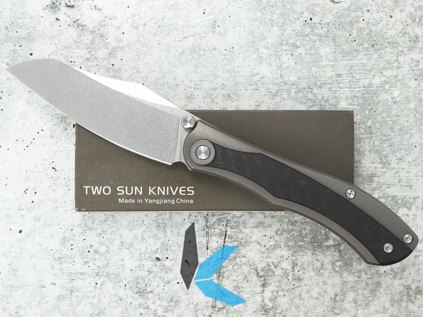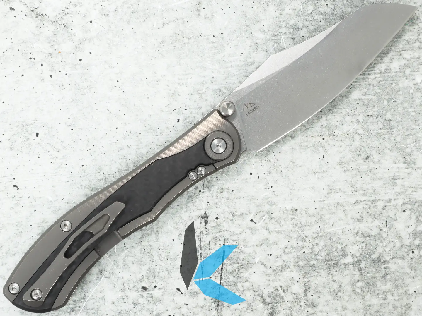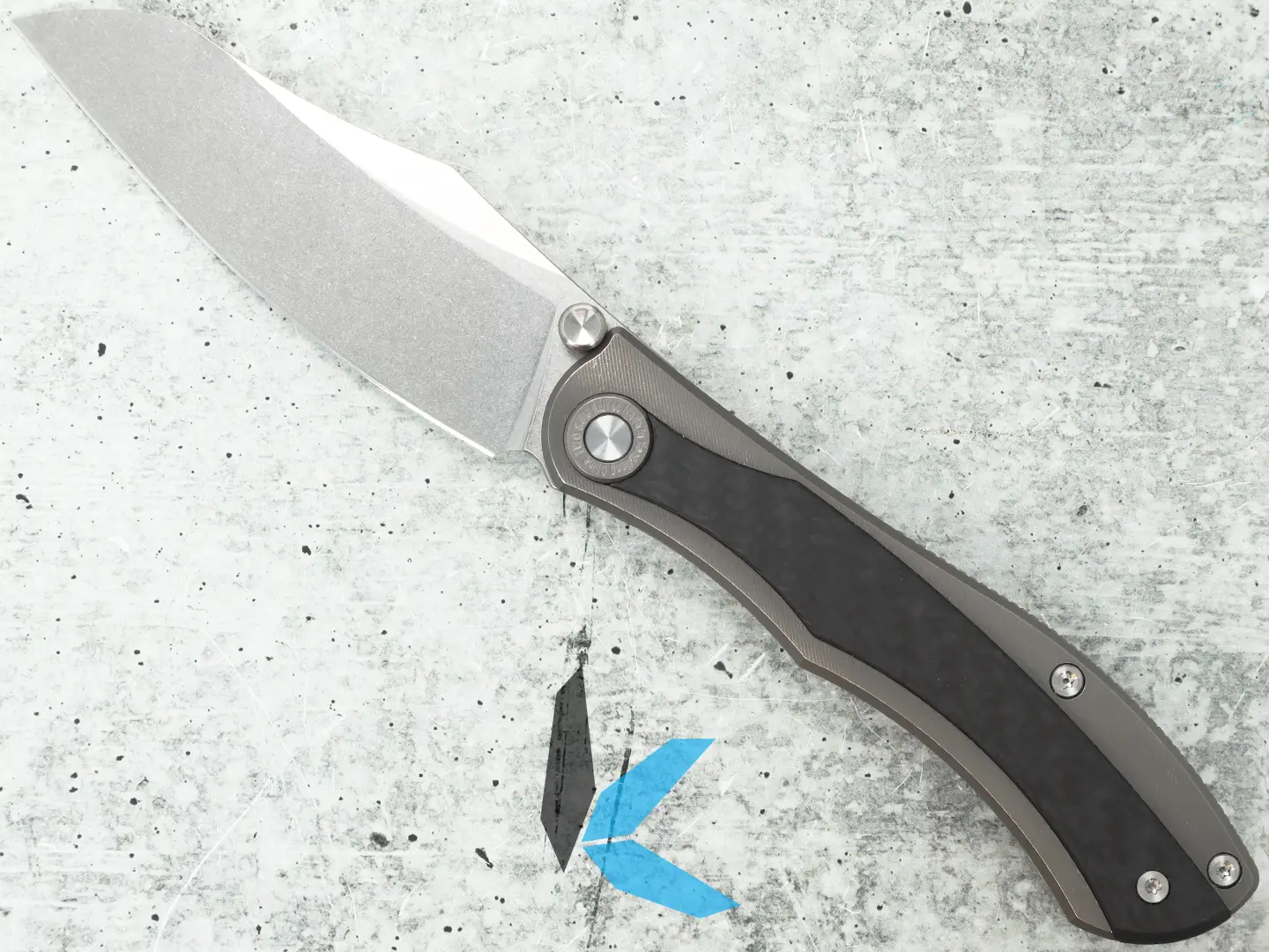 The handle combines gray titanium and carbon fiber, offering both strength and lightweight comfort in the hand. A frame lock mechanism ensures solid blade security during use, while the refined construction and premium materials give this knife a high-end feel without sacrificing practicality.