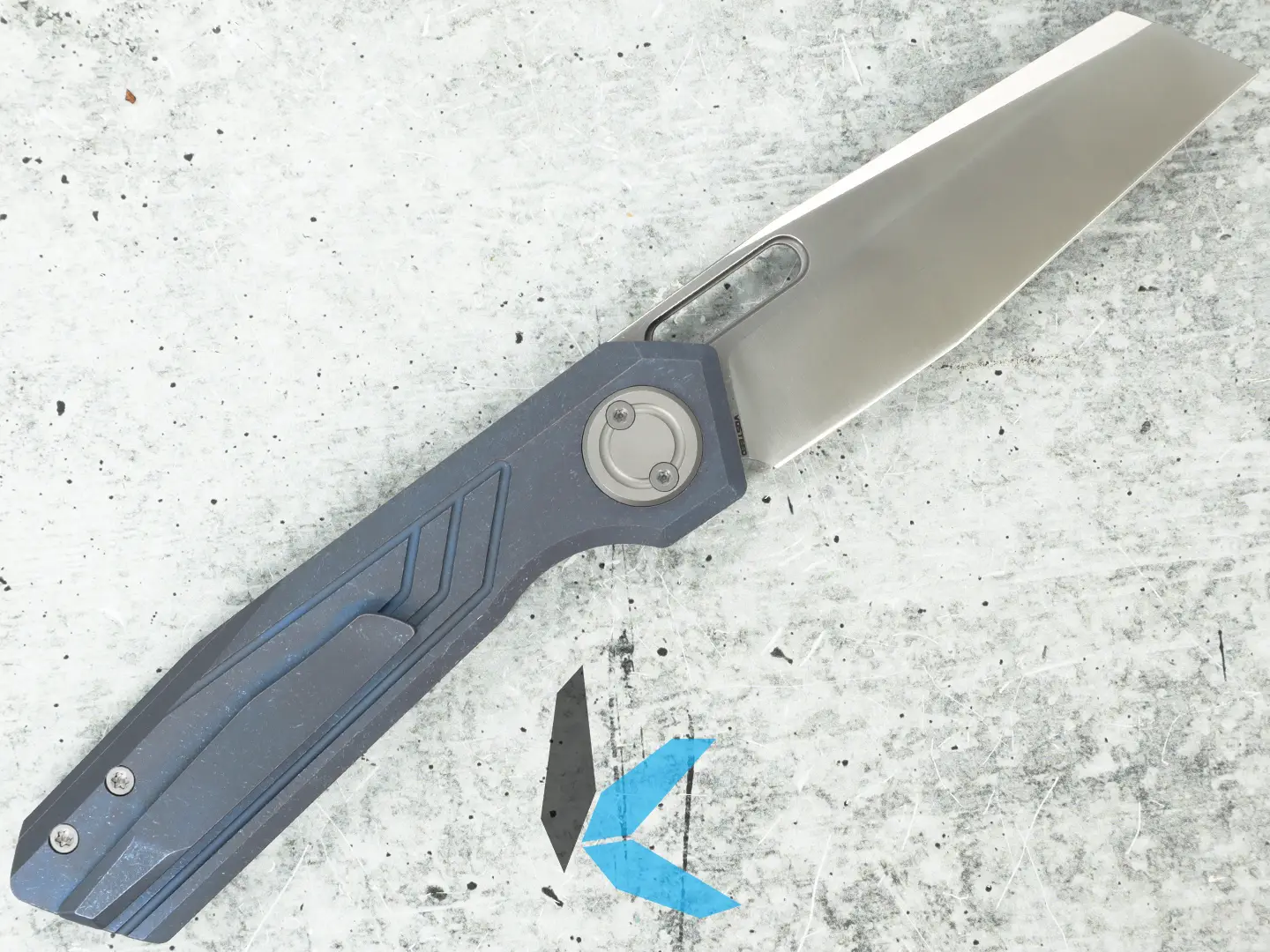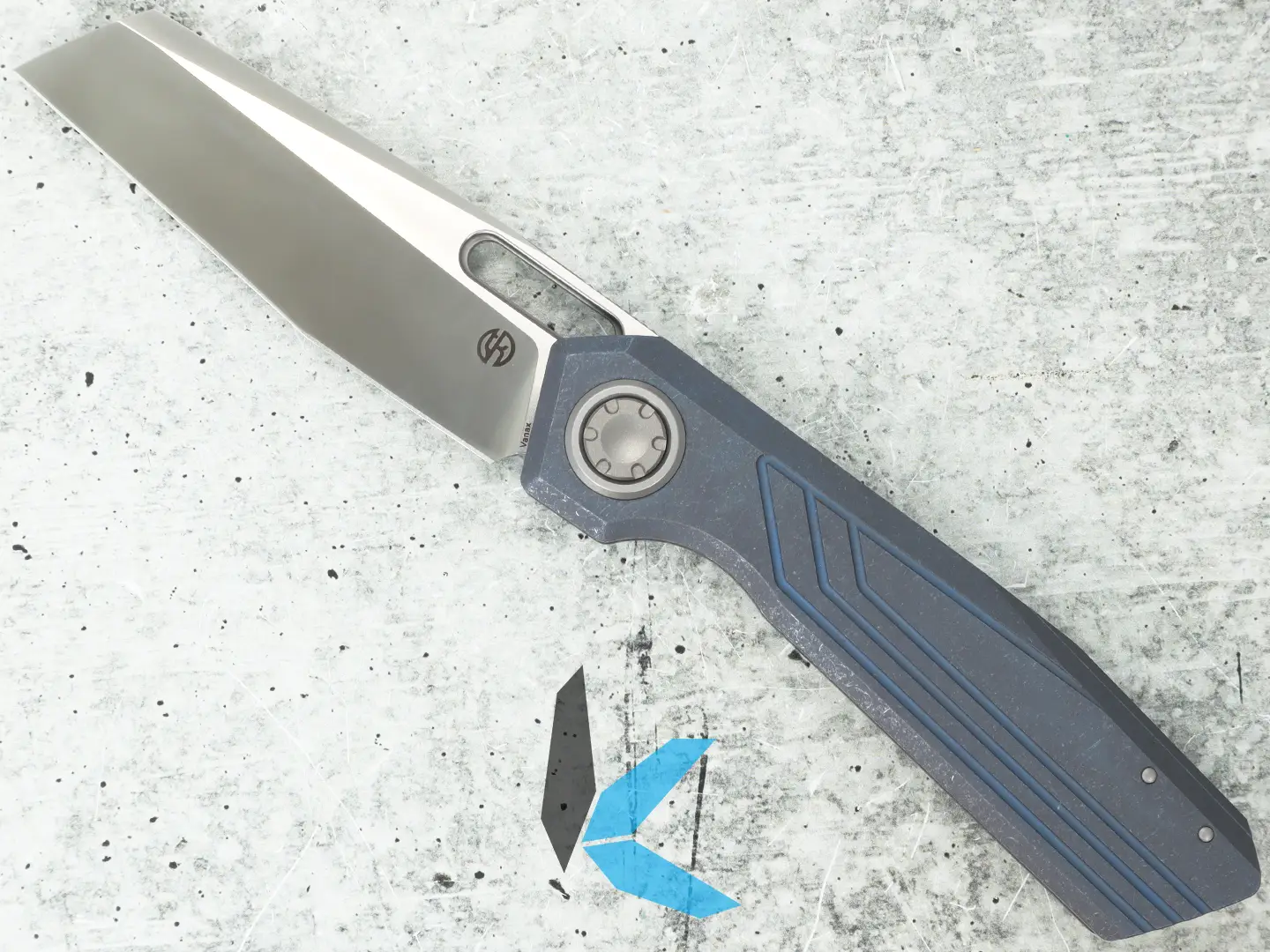 The knife is built around a blue titanium handle, providing a lightweight yet incredibly strong frame with ergonomic contours for a comfortable grip. Inside the handle is Vosteed’s Vanchor (pivot-style) lock, offering secure lockup and smooth operation while maintaining a sleek, mechanical aesthetic.